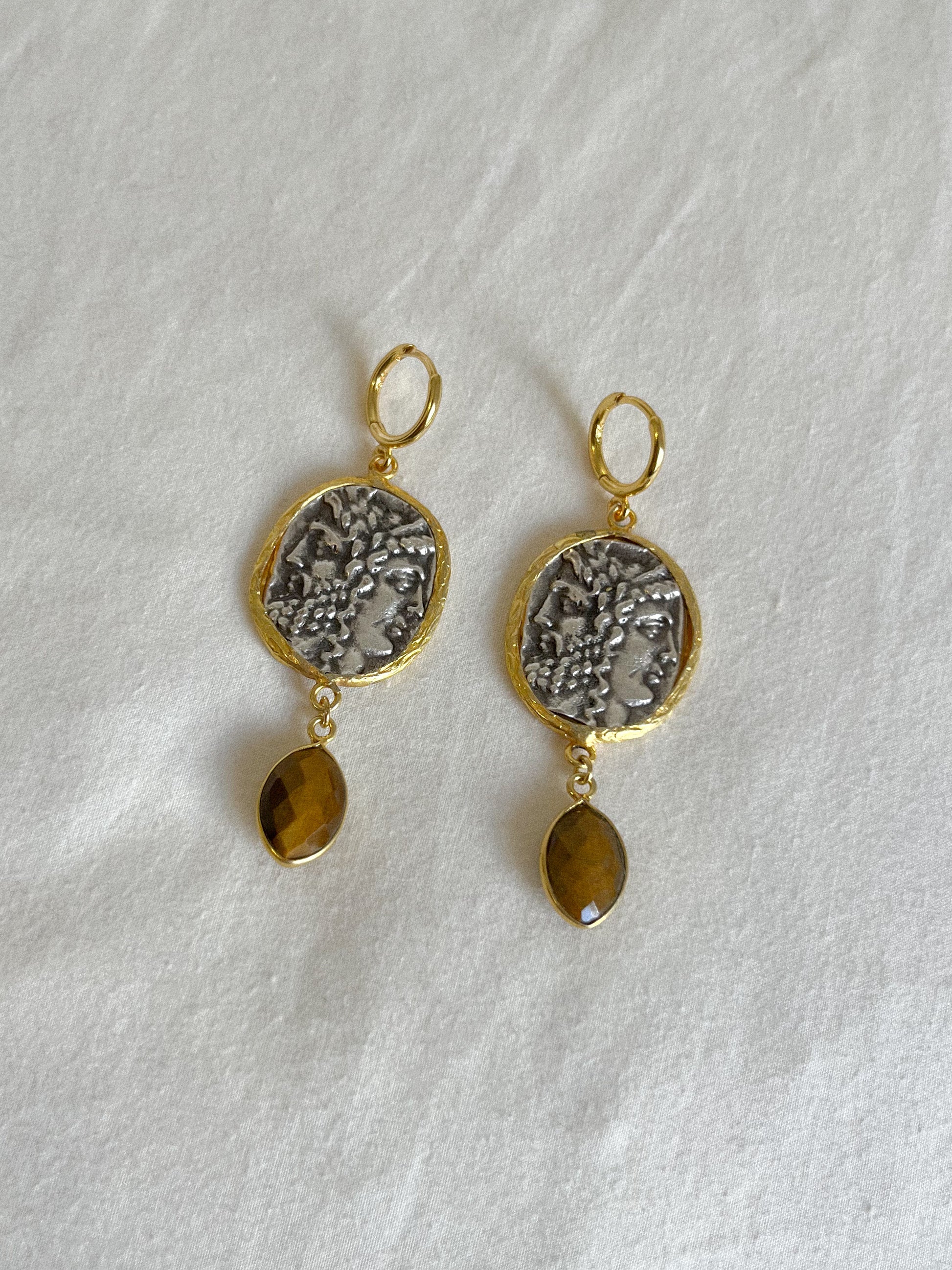 Materiales: Gancho en plata bañada en oro 18k. Base de ojo de tigre en plata chapada en oro 18k. Monedas en latón chapadas en plata y oro.